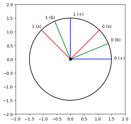 0, pi/2, pi/4, 3*pi/4, pi/8, 5*pi/8], ["blue", "blue", "red", "red", "green", "green"], ["0 (+)", "1 (+)", "0 (x)", "1 (x)", "0 (b)", "1 (b)"]) plot_trig([