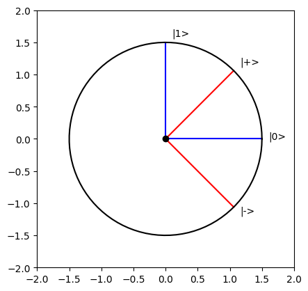 0, pi/2, pi/4, -pi/4], ["blue", "blue", "red", "red"], ["|0>", "|1>", "|+>", "|->"]) plot_trig([