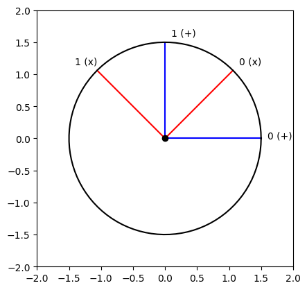 Not only the Bloch sphere can be used to represent qubits, we can simply use a trigonometric circle. The transition is explicit: the abscissa corresponds to \(|0\rangle\) and the ordinate to \(|1\rangle\), so \(|+\rangle\) is at \(\frac{\pi}{4}\). All states are on the circle, as the sum of probabilities, which here is an amplitude, is always \(1\). However, with this display, we lose information about the global phase.