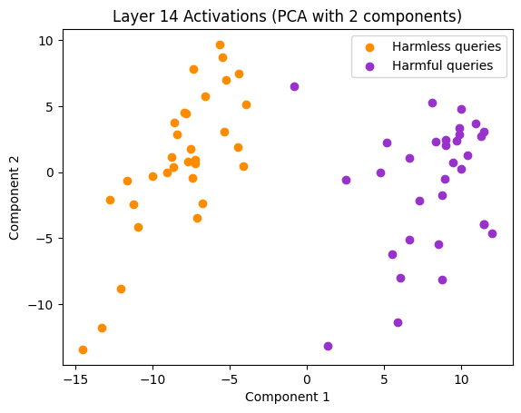 The paper “Refusal in Language Models is Mediated by a Single Direction” by Arditi et al. (2024) explores the refusal behaviour in large language models. They selected a dataset of harmful queries, which the model refused to answer, and a dataset of harmless queries, which the model answered without issue. By analysing the mean activations of the two datasets at each layer, they found that at a certain point, usually after the middle layer, two distinct clusters emerged.