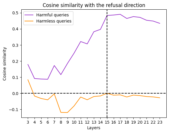 With this vector, it is possible to compute the cosine similarity with the activations at each layer, an efficient metric for measuring harmfulness that can distinguish between the two datasets.