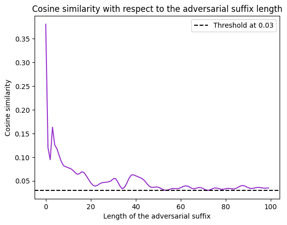 Cosine similarity with respect to the adversarial suffix length