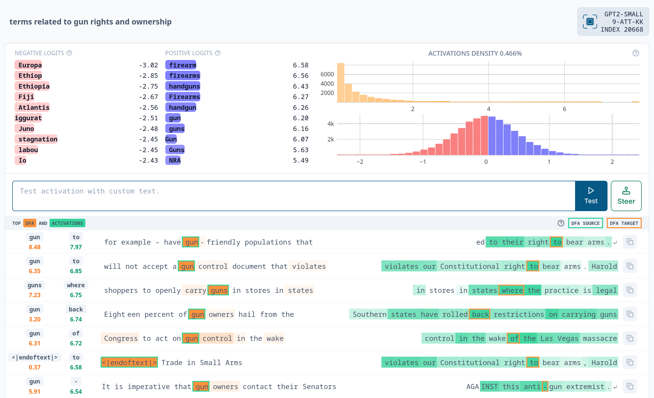 For those reading on smartphones, I’m interested in the positive logits. For our latent, they are: ” firearm”, ” firearms”, ” handguns”, ” Firearms”, ” handgun”, ” gun”, ” guns”, “Gun”, ” Guns”, and ” NRA”. And exactly as in the experiments with refusal directions, I obtained similar tokens with my reversed-logit lens: