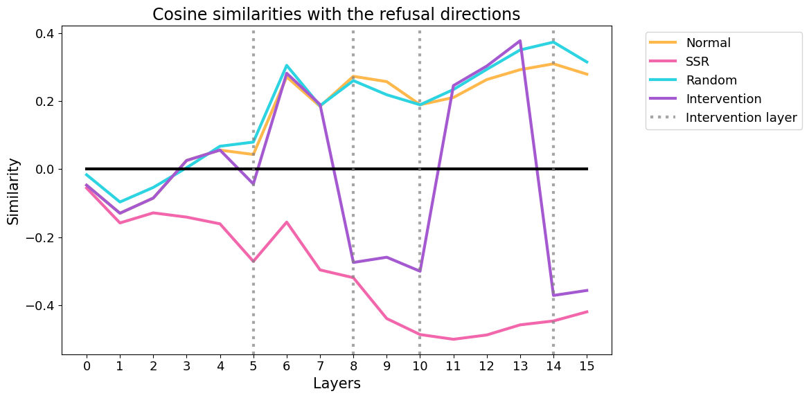 Beyond being sufficient to jailbreak the model, these results also reveal an interesting phenomenon: activations steered at runtime to be considered harmless quickly revert to their “harmful state”. Meanwhile, SSR generated inputs that consistently maintain a negative cosine similarity with the refusal direction, following a more “natural” path.