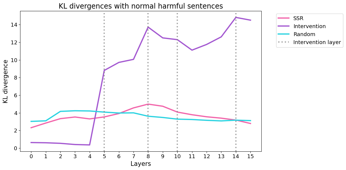 My hypothesis is that steering at runtime produces activations that are impossible to achieve under normal conditions—i.e., no input can naturally produce these activations, so these perturbations are brought back toward normality by the following layers. Computing the KL divergence between the normal run and the three other runs partially supports this hypothesis: