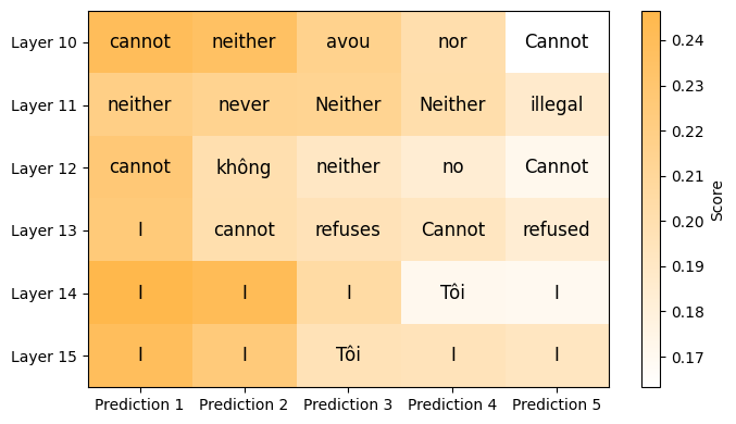 Yes, I had to talk about SAE, otherwise it’s not mechanistic isn’t it? :eyes:. Jokes apart, I obviously wanted to try my method using Sparse Autoencoders, but I was stuck at the first - and most important - step: finding good SAE latents to steer my model toward acceptance behavior, so unfortunately, I don’t have results on this front yet. However, I wanted to try something I find much more interesting than jailbreaking models: using SSR to reverse-logit lens stuff. The idea is simple: given a subspace, component, or whatever, use the SSR algorithm on an empty input - something like “[MASK][MASK][MASK][MASK][MASK][MASK]” - and observe what happens.