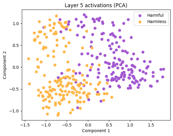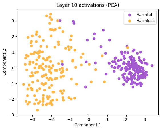 As visible in Figure 3, it’s possible to distinguish between harmful and harmless sentences using only one direction. This direction was termed the “refusal direction” by Arditi et al. (2024) and can be defined as the normalized difference in means between the activations of the two datasets.