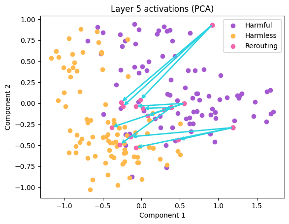 As its name suggests, subspace rerouting is about redirecting activations from one subspace to another. For instance, from the harmful subspace identified with our linear probes into the harmless subspace. The excellent Transformer Lens library makes the implementation nearly trivial.